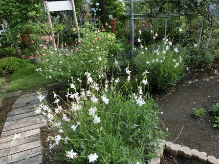 ガウラのある風景です。たくさんの蝶々が飛んでいるようですね~二ヶ月くらい前から咲き始めて、丈が高くなるので、雨風に倒れたりして、半分ほどに切り詰めました。すぐに、また伸びて来て、風に揺られて咲いています。そよ風に揺れる姿がとっても好き。風の似合う花だな、と思います。ピンクの花もいいですね~。ピンクの蝶々みたいです。一枚目の写真の木道みたいなのをこちらへ(手前へ)進むと、ここ。進む、といっても短い距離ですが・・・(笑)鉢に植わっているのはハーブのオレガノです。和名はハナハッカ。ツンツンと伸びた真っ直ぐな茎にチョンチョンと付いているこのツボミの状態が好き!去年、友人に株分けをしたのですが、地植えにしたらまっすぐに伸びないで、ふにゃふにゃと曲がってしまう、と言うのです。そんな筈がないな、と私も一部を地植えにしてみたら、本当にその通りでした。地面にふにゃふにゃと這いつくばって、この真っ直ぐなオレガノの良さが無いのです。理由は分かりませんが、そんなわけで、私の数少ない鉢植えです。 樹木の剪定に、庭師さんに入って頂きました。この方の剪定の仕方に、とっても惹かれているんです。女性の庭の人は、一度頼むと必ずまた頼むというほどファンがついていますよ。説明するのは難しいのですが、樹の幹を見せる、ということをいつも言ってますね。枝を抜いて抜いて、向こうが見えるくらいに透かせるのです。というわけで、風の吹き抜ける清清とした庭になり、私もすっきりした気分です。 ガーデニングで心掛けているのは、花の根元をすっきりさせて、風通しをよくする、というのが一番の考えなので、そこが合うみたい。定年後好きが昂じて始まった庭師さんなので、趣味みたいなものと、午前中来て頂いて、軽トラック一杯分の枝を始末してくれて、六千円です。お安いでしょう。エゴの木、椿、沙羅の木、梅、ロウバイ、カリン、カツラ、ジューンベリー、馬酔木、白椿、ハナミズキ、あと何があったかな~、これだけやってくれたんですよ。感謝感謝。 花ブログランキングに参加しています応援のクリックをよろしくお願いします。
