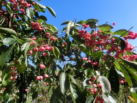 やっと、秋らしい青空が戻ってきました。いつまでも、庭にいたくなるような、居心地の良い気温です。マユミの実が、鈴なりにぶら下がり、ピンクの世界が広がっています。木の下にもぐると、青空をバックに可愛い実がぶら下がる光景が見えます。パカッと実が割れると、赤い種が飛び出してきます。種が落ちたあとの殻の中は、四つの部屋に分かれています。向田邦子さんの小説「胡桃の部屋」を思い出しました。マユミの実の部屋は、「胡桃の部屋」ほど複雑ではなく、簡潔で、あっさりとしていますね。近所の人に頼まれて病院へ付き添いました。三回目です。お礼に、お米を頂きました。そんなに気を使わなくていいよ、と思いますが、頼む方は、そうはいかないでしょうし、人にものを頼むのは大変ですね。もうほとんど治癒しているのですが、完治は難しいらしい。人に頼んで来ているので、なるべく長い期間の薬が欲しい、と言ったら、二ヶ月分を処方してくれたとか。次回は、12月末に行くことになります。 花ブログランキングに参加しています。 応援のクリックをよろしくお願いします。 昨日のアクセス数 1434 昨日のランキング 1 位