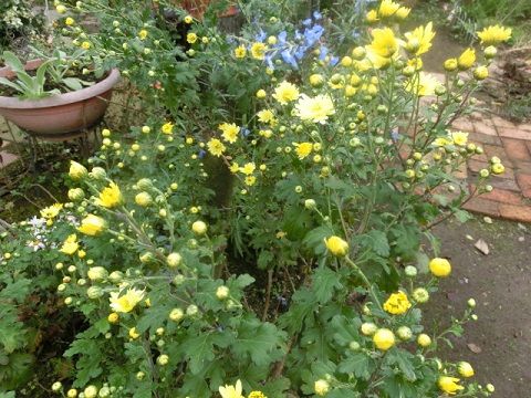 菊の季節がやってきました。うちの庭には、立派な菊は無くて、小菊ばかりなのですが、数種類が咲き始めたので、しばらくは小菊を見てやってください。今日は、黄色の小菊。ブルーセージとの色合わせが似合っています。黄色とブルー、いいですね~。咲き始めの菊たちは、とても清らかな感じがします。台風の影響で、また庭の手入れができないので、雨の降りだす前に少しでも、とせっせと草を抜いたり、枯れ葉を掃いたり。枯れ葉に埋もれて、なにやら美しい色が見えています。えっ、キチジョウソウだ~!キチジョウソウとは、「吉祥草」とこんな漢字を書きます。古来から縁起の良い植物とされ、花が咲くと良いことがあると言われています。二年ほど前に、昨日のブログに書いた入院中の友人から頂きました。去年も咲いたけれど、今年は、二株に増えて咲いています。きっと、友人の庭でも、人知れずひっそりと咲いていることでしょう。偶然にも、今日、この花を見つけたことが、とっても嬉しいです。物事がいい方向に向いていくような気がします。昨日、頂いたカブを煮て、あんかけにして食べました。丁寧に皮を剥き、真っ白なカブを箸で割れるほどに柔らかくコトコト。めちゃくちゃ美味しくて、有難いな、と言いながら食べました。 花ブログランキングに参加しています。 応援のクリックをよろしくお願いします。 昨日のアクセス数 1145 昨日のランキング 1 位