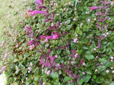 サルビア ラブアンドウィッシュです。地面に広がるポリゴナムを見下ろしてています。宿根草ですが、寒さにやや弱いので、家のそばに植えています。真冬には、腐葉土を被せておけば、越冬してくれます。赤紫の花と、濃紫のガクと茎、とてもシックな色合いです。もっと寒さが進むと、もっと冴えた色になることでしょう。金沢旅行の晴天を、奇跡だわ、と独り言をいうほど、まあ雨が続きますね。遊んだ後は、仕事が溜まっています。昨日も、せっせと仕事をし、今日もお昼までにこれをして、午後はこれをして、と予定を立てましたが、来客があったりで、なかなか。 花ブログランキングに参加しています。 応援のクリックをよろしくお願いします。 昨日のアクセス数 1259 昨日のランキング 4 位
