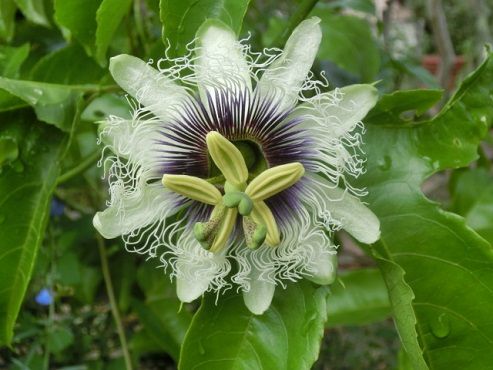 雨の中、ちょっと庭に出てみたら、また一つ、パッションフルーツの花が、開いた後、少し花びらを反り返らせて、一日花を終わらせようとしています。どれが雌蕊で、どれが雌蕊か、ホント、不思議な形をしていますね。全体は、こんな感じに、明るい緑色の大きな葉がふさふさと茂っています。蟻か、蜂か、蝶々か、だれが交配してくれたのか、実がいくつかなっています。右側の小さいほうの実で、鶏卵くらいの大きさです。左側のは、相当大きくなっています。奄美大島が特産地だそうで、暖かな場所で育つフルーツです。群馬で、これから寒くなるのに、育ってくれるのかしら。緑色の実が、紫色に変化して、表面に皺が寄ってきたら、食べころとか。さて、これからどうなっていくのかしら。興味津々です。 花ブログランキングに参加しています。 応援のクリックをよろしくお願いします。 昨日のアクセス数 1292 昨日のランキング 2 位