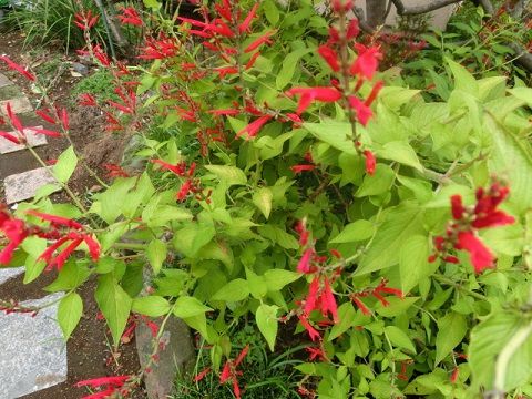 今朝のEテレ「趣味の園芸」に登場していた、パイナップルセージです。寒さにやや弱いので、家屋に近い場所に植えています。三年ほど、大丈夫だったのに、冬に枯れてしまいました。そんな話をしていたら、今年の春に、友人が株分けして持って来てくれました。それが、いまは、こんなに立派に成長しました。葉がライムグリーンで美しいだけではなく、名前の通りに、葉をこすると柑橘系の香りがしますよ。瓔珞(ようらく)という言葉があります。仏像や、昔の高貴な人の装身具で、髪につけて額に垂れ下がっていたり、首輪だったり、手首を飾ったりするものですが、毎年、パイナップルセージの花を見ると、瓔珞みたい、と思います。セージなので、花は、色が違うだけで、形はメドーセージとかにそっくりですね。今年の冬は、しっかりと防寒対策をしたい、と思います。お隣さんから、茨城ひたちなか市から買ってきたという魚を頂きました。醤油と酒に付け込んで、焼いて食べるといいよ、というアドバイス。さっそく漬けておきました。ごちそうさま。ほかに、やはり茨城の栗饅頭も頂きました。涼しくなってきて、熱いお茶の美味しいこと。感謝です。湯飲みの模様は、萩の花です。そうそう、昨日開花したパッションフルーツの花は、やはり一日花で、今朝は、こんなふうにつぼまっていました。 花ブログランキングに参加しています。 応援のクリックをよろしくお願いします。 昨日のアクセス数 1589 昨日のランキング 1 位