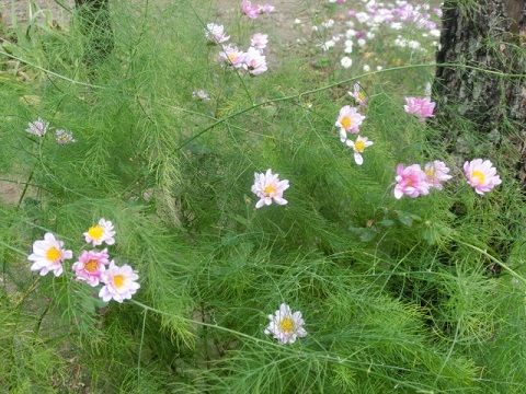 先日から、なんだか「素敵~!」と思っている景色です。おわかりでしょうか。アスパラガスと小菊の組み合わせです。うん、いい! なんだか、いいわ~。小菊たちが勝手にアスパラガスの群れに侵入して、自分で作った景色です。柔らかな緑色に囲まれて、ピンクの小菊も優しい表情をしています。アスパラガスの根元を覗き込んでみましょう。まるで林のように、緑色の茎たちが直立しています。その合間に、菊の茎も混在しています。これは、花後に抜き取りましょう。私は、よく分からずに我流で育てていますが、この場所で、アスパラさんは十年生になりました。いや、もっとかな。もう少しすると、緑の葉は黄色く枯れてきます。そしたら、根元から10cmくらいのところで刈り取ります。あとは、腐葉土や、堆肥をかぶせて春の収穫を待ちます。本当は、違う場所に、株分けして植え替えるのが良いようですが、毎年、そう思いながら、結局はそのままにして過ごしています。昨日の夕方、お赤飯が届きました。おいしそう~~。感謝。さっそく、お赤飯を夕ご飯にして、一人で頂きました。カボチャの煮物、焼き鮭、人参シリシリ、古漬け、とろろ昆布汁、柿。揚げ豆腐を作ろう、と朝から水切りしていたのに、すっかり忘れてしまいました。今日の午後は、Y先生とAちゃんと三人で、施設のS子さんを訪問します。晴れてきて、陽が射し、気温が上がってきたのでほっとしています。あんまり寒いと、風邪でもひいてはと心配が増えますので。 花ブログランキングに参加しています。 応援のクリックをよろしくお願いします。 昨日のアクセス数 1395 昨日のランキング 2 位