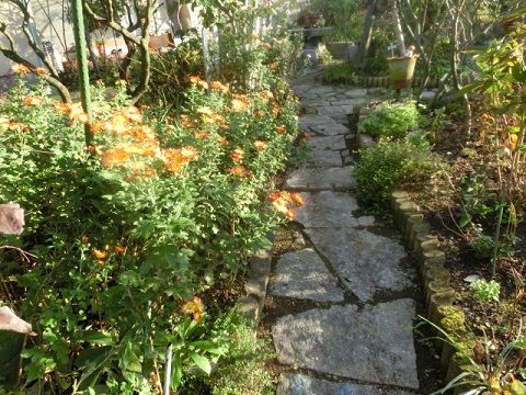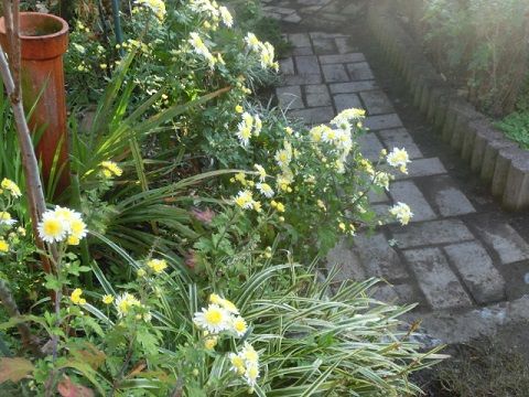 小菊が咲き乱れる小道。本当は、もっときれいなのに、陽が射してしまい、ぼやけてしまいました。言い訳です(笑)。オレンジ色の小菊。オレンジ色の先に咲いているのは、薄いピンクの小菊。とっても優し気な色です。小道の反対側は、黄色の小菊が咲いています。ちょっとオレンジ色がかかった黄色で、美しいです。先週からの約束で、秋の庭への変化が見たい、などという人がいて、どうぞと言ったら、遊びに来てくれました。先日の旅先の金沢で買った、とっても美味しいきんつばをお茶菓子に、と思っていたのですが、そういえば、彼女は紅茶が好きだったな、と急きょ、貰い物のリンゴを煮て、冷凍パイシートでアップルパイを作りました。丁寧に、心を込めて作ったので、とても美味しそうに出来上がりました。でも、きんつばが食べたい、というので、アップルパイはお土産に持って帰ってもらいましょう。庭は、丁寧に丁寧に、小道を巡ってくれ、小さな足元の花にも目が行き、ホントに花が好きなことがよく分かります。「わたし、ここに半日でも飽きずにいられるよ」というので、「それは困るんですけれど」と大笑いです。見て見て、とパッションフルーツの実を見せたり、楽しい時間です。貰い物だけれど、おすそ分け、と虎屋の羊羹を頂きました。高い入園料になりましたね~。 花ブログランキングに参加しています。 応援のクリックをよろしくお願いします。 昨日のアクセス数 1346 昨日のランキング 1 位