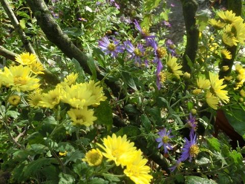 ノコンギクと、黄菊が一緒に咲いています。黄色と濃紫、キリッと引き締まった取り合わせです。デザインのセンスはないので、偶然ですけれど。汚れを知らないこどものように~♪♪開き始めの小菊は、本当に清らかです。深い藍色のノコンギクは、この一画のアクセントになっています。友人の娘さんから電話。この連休を利用して、二泊三日で、友人が試し退院をします。自宅で過ごす、まずは、回復へ向けての第一段階です。これがクリアできたらどんなに自信がつくことでしょう。娘さんとお姉さんで、一泊ずつ付き添うようです。同じ日程で、私は娘の家へ行くので、会うことは出来ません。まだ静かにしておいた方がいいかもしれないし、彼女の気持ち第一で待ちたいと思います。 花ブログランキングに参加しています。 応援のクリックをよろしくお願いします。 昨日のアクセス数 1405 昨日のランキング 1 位
