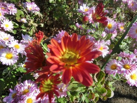 お日様が暖かい~~。それだけで幸せを感じます。この紅い色の小菊、今年は無くなってしまったんだ、と思っていましたら、二本だけ出てきて、花が咲きました。この色を、増やさなくては。切ってしまうと、どれがどの色の小菊か、分からなくなるので、茎の根元にグリーンのテープを巻いておきました。春になると、周りに出た芽を育て、この子を増やしましょう。この一か月に登場した庭にある色とりどりの小菊たちを、一堂に集めました。見てやってくださいね。これで終わりです。見て頂いて有難うございました。 花ブログランキングに参加しています。 応援のクリックをよろしくお願いします。 昨日のアクセス数 1703 昨日のランキング 2 位