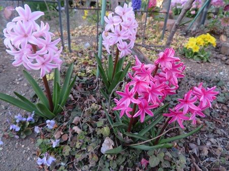 ヒヤシンスは、花期が長いですね~。植えている場所によって、咲く時期や、勢いに大きく差があり、まだ咲いていないのもあります。写真の濃いピンクの子は、一球から三本出ています。薄いピンクも綺麗! 香りも素晴らしい!近所の友人は、うちの前まで来ると、ヒヤシンスの香りが漂ってくる、と言ってくれます。確かに、鼻の効く人なのですが、私は、鼻を近づけないと、分からないので、ホントかな、と思いました(笑)。そうそう、この友人のお孫さんの、高校受験の発表が、昨日あり、合格でした。昨日、電話で知らせてくれたのですが、ホントに良かったな、と思いました。ママが生きていたら、喜ぶでしょうに、心の中で、そっと思いました。黄色のヒヤシンスは、やっと咲き始めました。白いヒヤシンスは、終わりかけています。この白い子は、咲き始めですが、もう何年目かなので、花付きがまばらになっています。午後は、月一回のAさん訪問日。買い物出ないで、持って行けるもの、そうだ、チラシ寿司だ。Aさんも、大好きで喜んでくれるのです。二月から、三回目のちらし寿司です。青みのキヌサヤが無いけれど、人参、どんこ椎茸、ヒジキ、油揚げ、とても美味しく出来ました。残ったのは一食分ずつ、冷凍しておきます。レンジでチンして、温かな酢飯も美味しいですよ。お茶を用意して、待っていて下さいました。知識の豊富な方で、話は弾み、時間はすぐに過ぎてしまいます。京焼きの素敵な箸置きを頂きました。こういうものを見ると、これを使って、食事会がしたくなります。菊芋や、かき菜や、ブロッコリーも頂いてきました。チマミさんのお庭、いま、綺麗でしょうね、というので、水仙、クリローが花盛り、ぜひ覗きに来てください、と言いました。車で迎えに来ますよ、と言うのですが、自分で歩いて行きたい、と言います。歩いても、20分くらいなので、でも、膝が悪いから、30分かかるかも。車だと簡単ですが、まあ本人の意思を尊重します。 花ブログランキンに参加しています。 応援のクリックをよろしくお願いします。 昨日のアクセス数 1529 昨日のランキング順 6 位