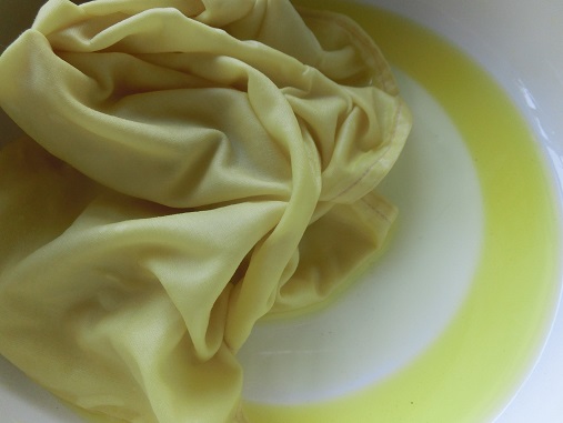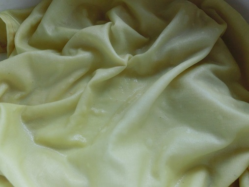 ミョウバン液に浸して防染します。みるみる黄色が濃くなりました。