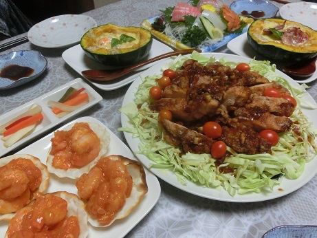 夕食は、 淋鶏(ユーリンチー)、エビチリ(餃子の皮を焼いた器に盛ります)、