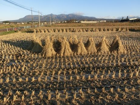朝の散歩途中で、わらボッチの景色を見つけました。後ろは赤城山。