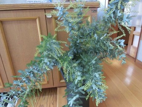 玄関先のミモザが、黄色の蕾を膨らませて、枝をふさふさと揺らしています。