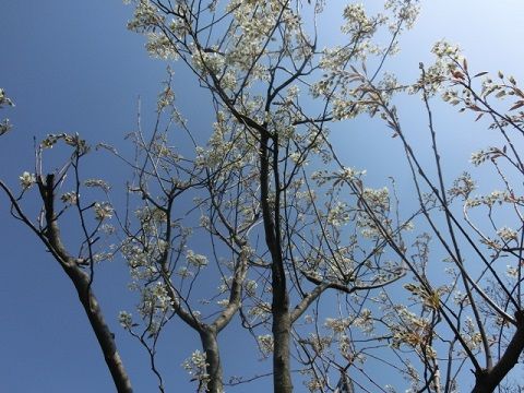 満開のボケの花と、頭上高くジューンベリーの花が競演しています。