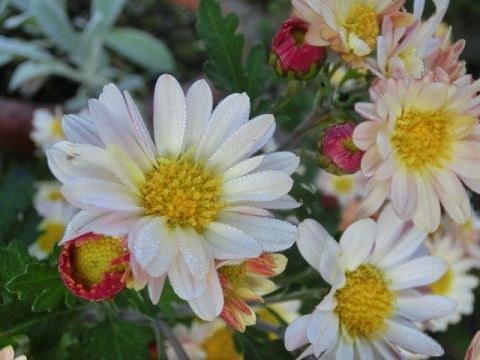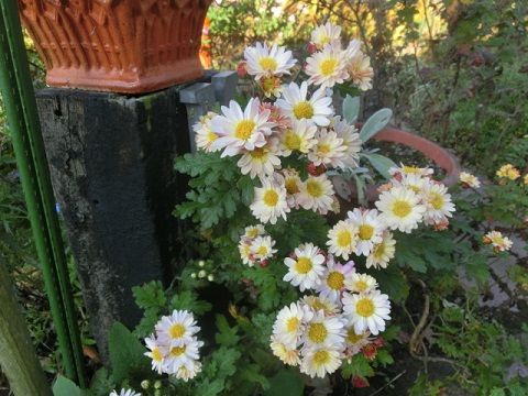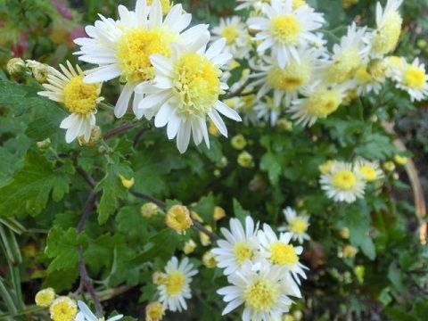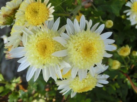 白い花びら、黄色の真ん中がポコリと可愛く盛り上がっています。