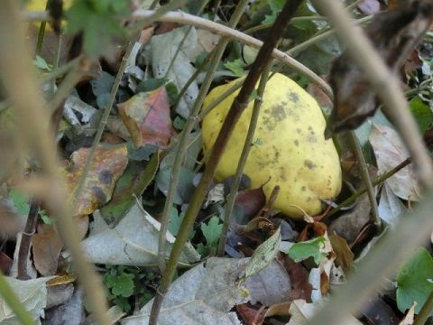 ​​​​​​​​​​青空をバックに、黄色のカリンの実が大きくなって、美しい光景です。
