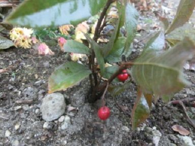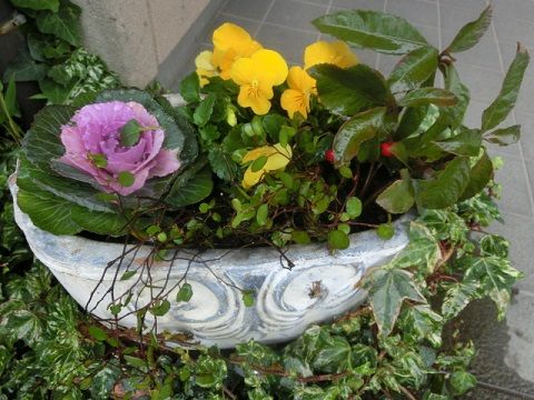ビオラ一株、葉ボタン一株、あとは庭のヤブコウジとプミラを使って。