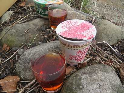 大沼のほとりで、Kさん持参の熱いお湯で、