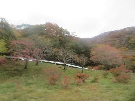 紅葉は、まっ盛り、右手の山は色とりどりで、