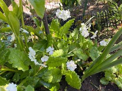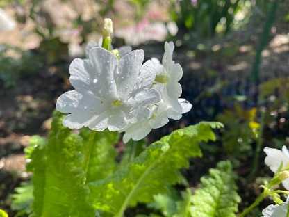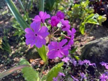 シャクナゲの木の下、木陰に日本桜草が。