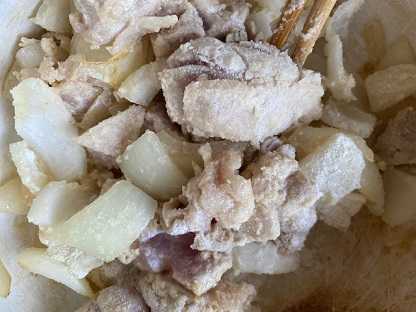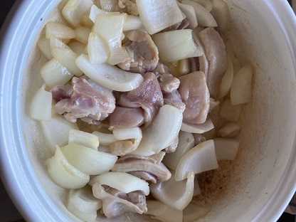 油とバターで、玉葱と鶏肉を炒めます。