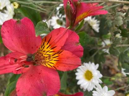 白い小菊に混じって、アルストロメリアが、