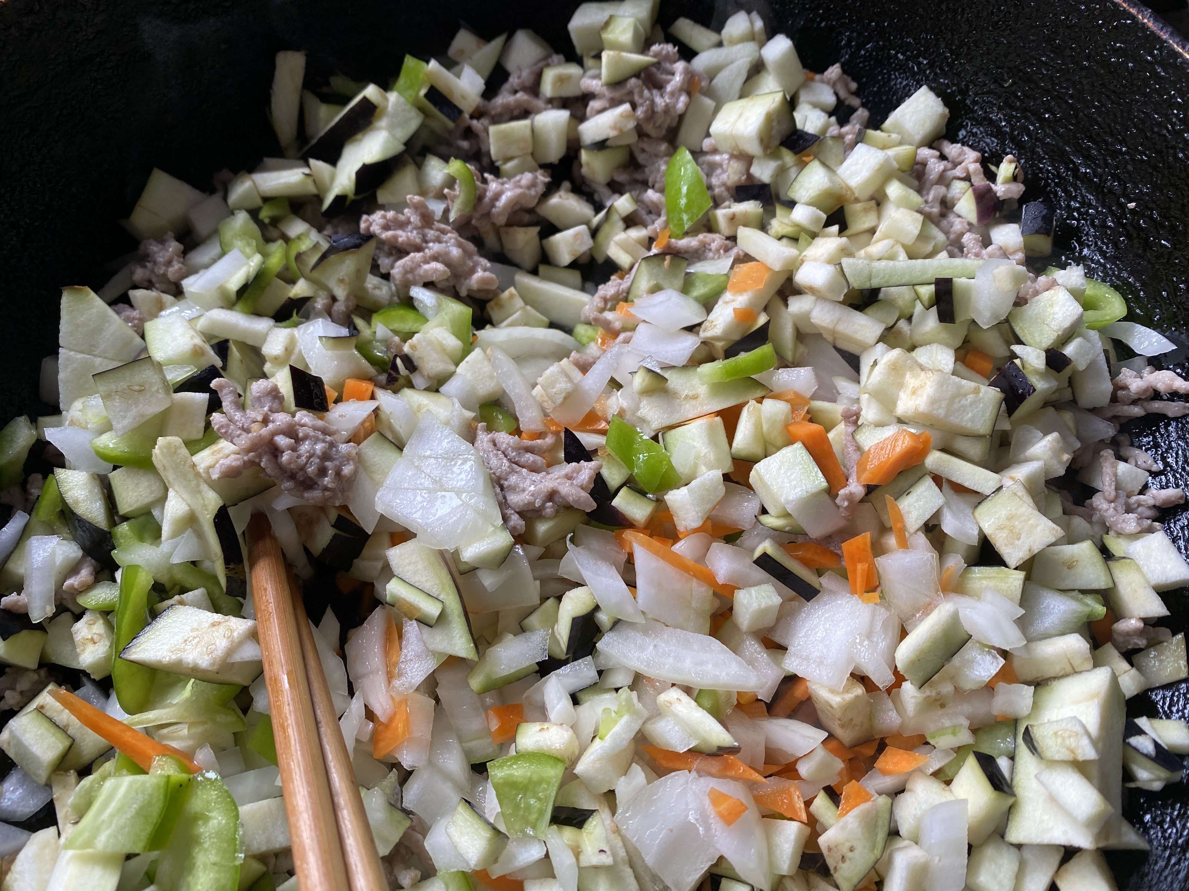 生姜と挽肉を炒め、ある野菜を全て微塵切りにして炒め、