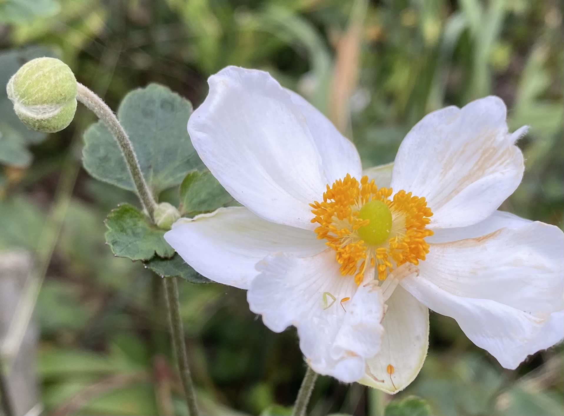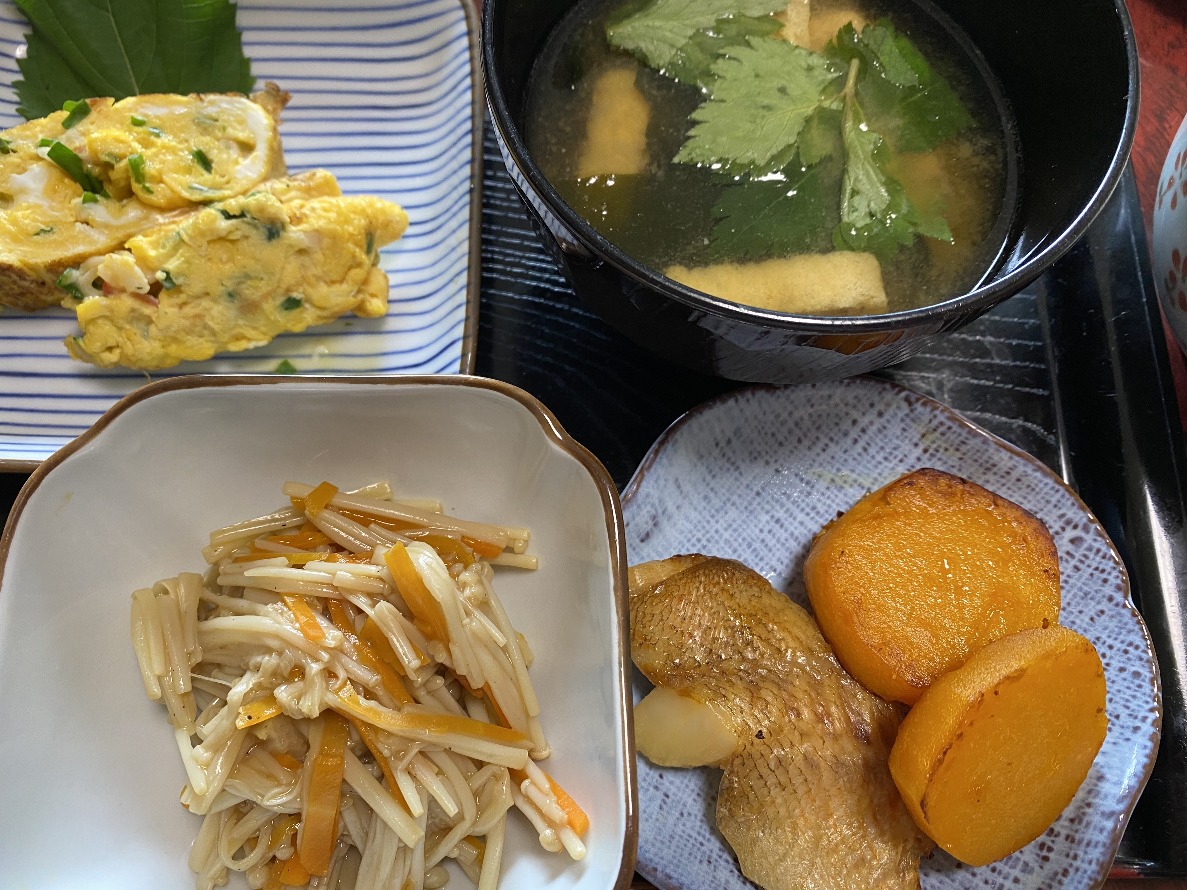 庭のニラを入れた卵焼き、エノキと人参、赤魚、味噌汁。