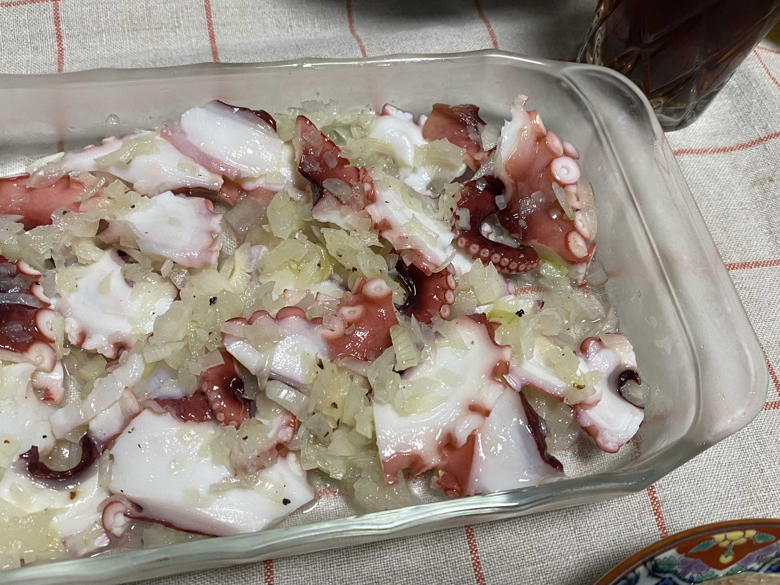 加えて、タコを漬け、冷蔵庫で冷やす。