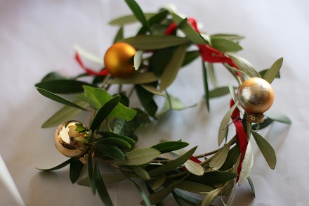 ベランダのオリーブが茂っていたので、何気なくカットして、ふと、もったいない、、と思ってしまったのです。で、クリスマスに向けて、リース作りの練習でもしておこう、、と小さく円形にして、作ってみました。小さいのをたくさん作るのもいいかもしれない、、。