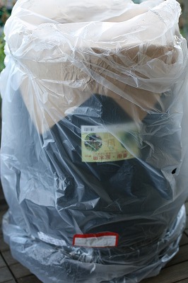 届きました。大きな荷物。さて、これは?逆に、、いや、本来の向きに置くと分かりますね。はーい!鉢です!これ、かなり大きいです。バナナ、いちじくなど、果樹はこの大きな鉢に植え替えて、来年は収穫アップを狙います!