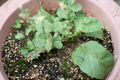 これ、何の葉か分かりますか?ルッコラ!そう、食べると胡麻の味がする、美味なる葉っぱなのです。実は、これ、前に収穫した残りの一部についた花をそのままにして、種までつけたんです。その種を蒔いたのではなくて、自然に落ちたものがまた発芽して大きくなっているんですよ。自然の循環で、大きく育ってくれるとうれしいな。手間をかけず、収穫できるのもうれしい。