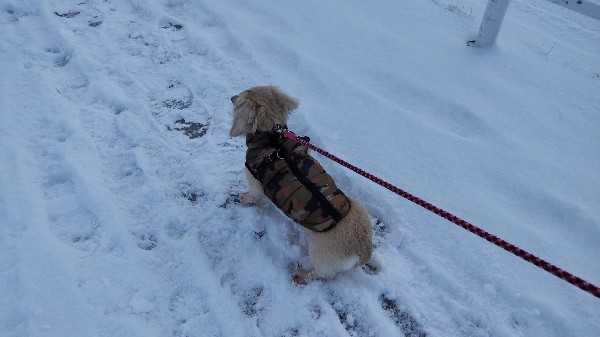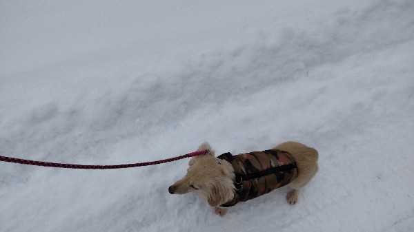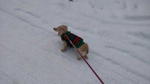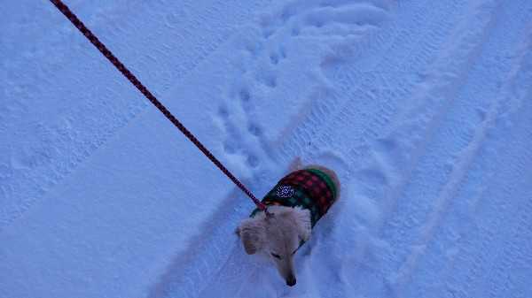 いやいや、それだけでは無いんです。雪降って欲しいなんてね~!今朝は、さらっと積もりました。歩きやすかったです!だんなさんの会社の人たちも、昨日は遅刻して来た人もいたそうです。借りてる駐車場から職場までの道がツルツルで、歩けなくてだったそうです。そして、庭のバラ。前にもこういう年があって、庭にお布団代わりの雪が無くて、しばれて凍害。今年もそうなりそうで心配です。道東や道北では、停電になるほどの積雪の所もあるのに。今朝は、お散歩どうしようかと思いましたが、行きたいと言うので行って来ました。雪かきしてない歩道は、こんな感じ。雪の下は氷です。気を付けて歩きました~!エイミーも歩きやすかったようで、肉球舐めて歩かなくなったのは最後の方だけでした。やっぱり氷の上を歩くのがつらいんですね。またの為に、ゴムサックみたいの注文しました。履いて歩けるといいですけどね。エイミーの足は前足が太くて後ろ足は細い。なので、SサイズとMサイズを頼んでみました。サイズが合うといいけど~!あ、お散歩でマルちゃんと会ったんですが、エイミーに気付いてリード引いたんでしょうね。引っ張られて飼い主さん目の前ですってんころりん!雪の下は氷ですからね。気持ちのいいくらいの転び方でした。高校生?中学生?の飼い主さん、恥ずかしそうに足早になってました。笑怪我無くて良かったです。