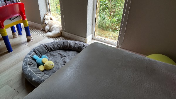 お散歩から帰って、少し目立つ雑草むしりして家に入りました。エイミーの足洗ってたら、あら!雨です。風が無いので、シャーって感じです。天気予報では、雨マーク消えてたのに。けっこう降ってます。濡れなくて良かった♪こちらの涼しさが、札幌方面に移動した?今日の札幌、最高気温23度の予報です。こちら道南は、あの涼しさは何処へ?連日の30度予報です( ´゚д゚`)ちょっと動くと汗!あら、書いてたら晴れて来た。お日さま出て来た。朝も、カーテン開けて窓開けたら雨で、慌てて閉めました。あ、お散歩から帰ったら、だんなさん、1人で朝ご飯食べてた。夜中まで柔道みてたようで、起きて来なかったんですよね。自分でご飯チンして、目玉焼き焼いたんだって!偉そうに言って食べてた!やれば出来るんだ!笑そりゃそうですよね。独身時代、一人暮らしだったし、旭川に単身赴任もしてたしね。あら、明るくなった♪どうした、エイミー(^-^)そこ、涼しい?