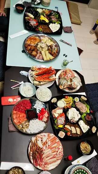 くじら汁(私と孫たちは、くじら無しのけんちん汁)、茶碗蒸し、ホタテのもと焼き、オードブル(今回もキッチンSATOUの)にお刺身等々。