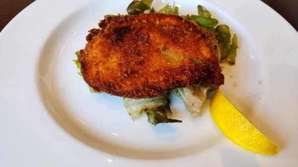 ここのお店の魚料理は、アーモンドで揚げたのなんだけど、今日はホッケのムニエルだと言うので、お肉にしました。