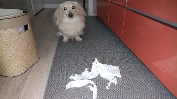 エイミー、キッチンのマットの上に置いてるキッチンペーパーにダッシュで千切るのが楽しい?