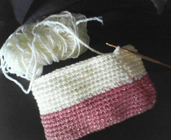 白とピンクのラメの糸でポーチを編み中ですひたすら細編みもうちょと!!