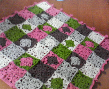 やっとひざ掛け完成です細い糸だったから時間がかかりましたふちは、クローバーのモチーフを付けました