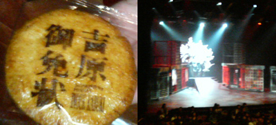 本日、hさんのおかげで楽日に行くことが出来ました。楽日では、写真のお煎餅が振舞われる・・・皆の分ありますからね!と、おっしゃる古田さん。ないでやんす(ん?この言い方は怪物ランドのひとみたいだ)皆になんて いきわたらなかったよぉぉ(TT)写真は、幸運にもお煎餅をGETした方にお願いして画像だけとらせていただきました。ありがとうございました。あぁぁ。。。残念。けれど、千秋楽 とーっても よかったです。この舞台は回数をこなして みればみるほど 面白くなります。唐剣を落としてしまうハプニングもあって思わず「あっ」って私がいっちゃいました(笑他にも、最後だからと おもいっきりやってる部分もありました。私は、3回目の観劇なので贅沢にも、ここのシーンのあの人のあの表情をみたい!という感じでみてきました。他の人が話してても 堤真一さんをオペラグラスで凝視!は~ほれぼれ。胸元の汗には クラクラ・・・そして、今までは 松雪さんばかりをみてたので今回は京野ちゃんを凝視。んま~可愛い!!!お化粧も 松雪さんとは対照的なお化粧をしてて本当に可愛い太夫になってました。何をどう書けばいいのかわかりませんがとにかく この舞台3回いけて 本当によかったと心から思っています。本当は大阪の舞台もみてみたかった。。。これから 大阪の舞台にいく皆さん楽しいレビューお待ちしております。それから舞台のチケットをとってくれたYちゃん、Fさん、Hさん心からお礼を言います。ありがとう。そして これからもヨロシクね!?(笑