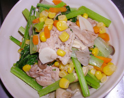 豚肉、舞茸、青梗菜(OR 小松菜)、コーン、にんじんなどを適当にいれ