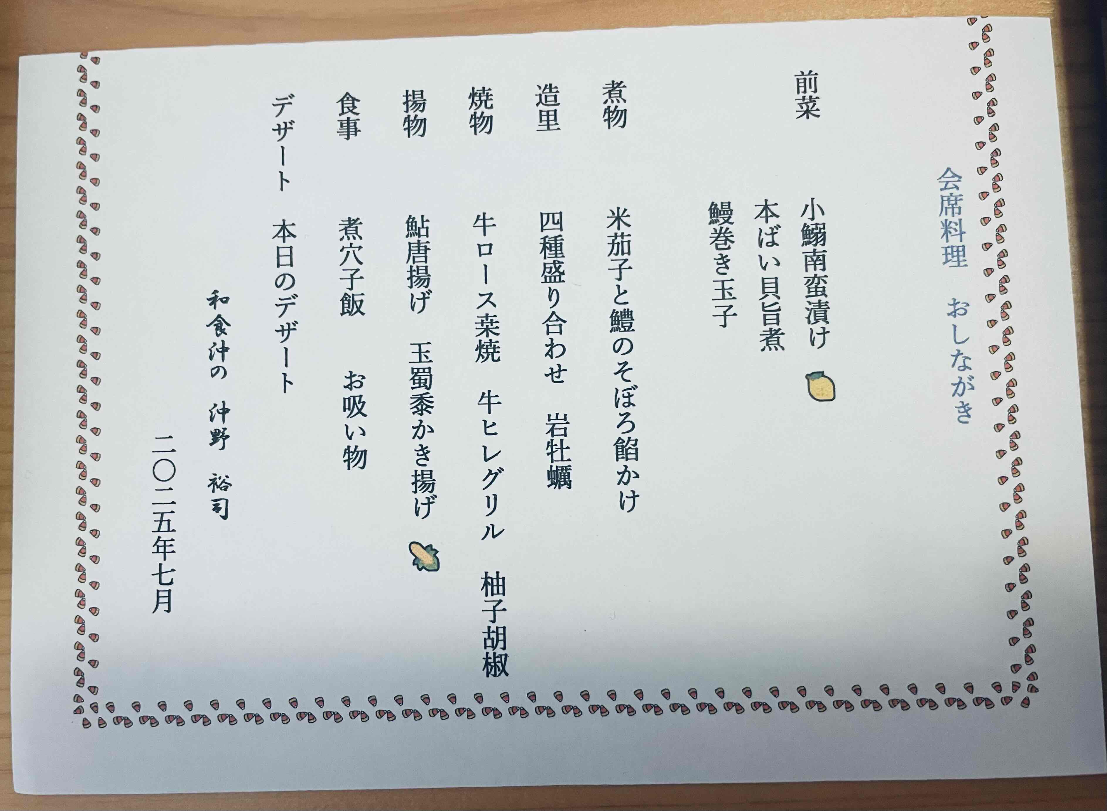 件名: 2025年7月1日、和食 沖にて1万円のコース料理