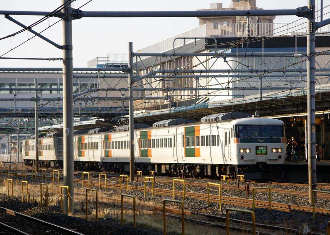 185系元チタB編成:特急「草津」平成25年3月ダイヤ改正において、田町車両センターが廃止されることに伴い、通勤車が国府津へ、特急形が大宮へ転属となりました。これに合わせ、既存の185系OM車も、方向転換及びグリーン車の連結位置を変えるなどの作業が行われることになります。185系OM車は、ごく一部が改正前からこの作業に取り掛かりましたが、1日で切り替えるわけにも行かず、元チタ車のB編成を動員し、改正直後の高崎線特急やホームライナー等に充当され.もちろん「草津」にも運用されました平成25年3月16日 B3編成 「草津32号」平成25年3月17日 B1編成 「草津32号」平成25年3月20日 B3編成 「草津1号」平成25年3月24日 B5編成 「草津1号」平成25年5月4日 B2編成 「草津31号」平成25年5月18日 B6編成 「草津32号」元チタ車の湘南ブロック色編成も、OM車の準備が整い次第終了となったため、湘南カラーでグリーン車込み7連で残ったB1編成を除いては、かなり短い期間でしか見ることができませんでした。