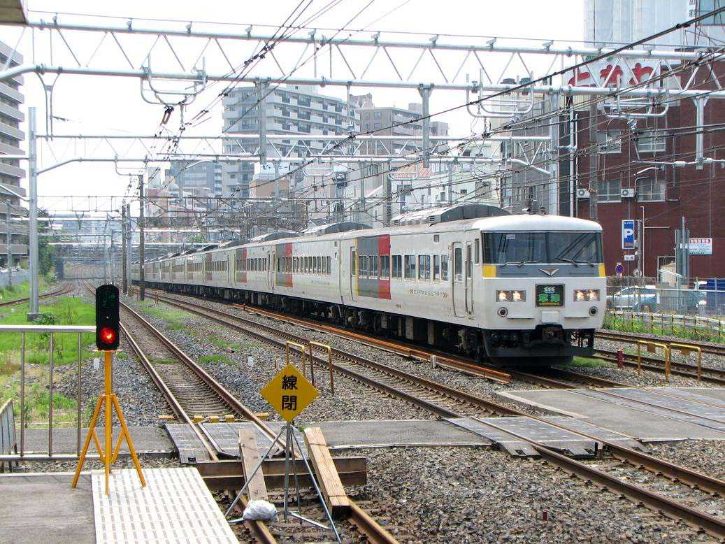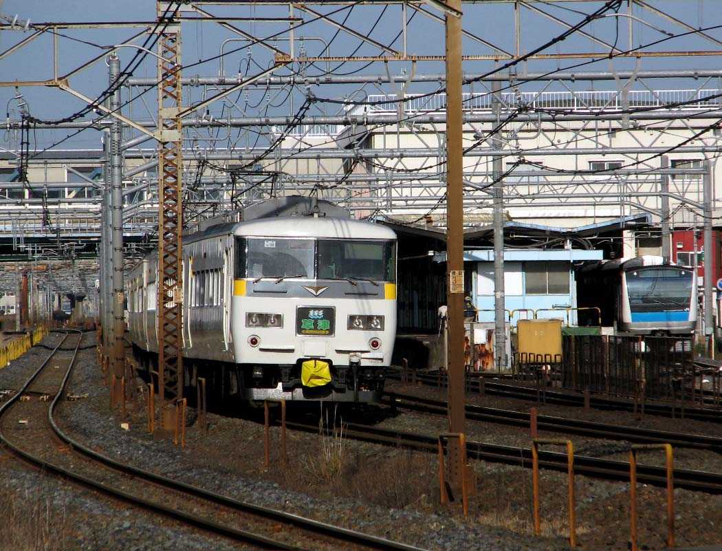 優等列車も早朝から夕方までの列車が貨物線迂回となり、このように普段は貨物線を通ることのない185系7+7の14連が貨物線を走るという、珍しい現象が起きました。