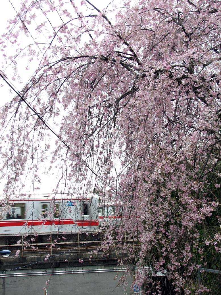 天気が悪いので、花の色の濃い枝垂桜の方が映えますね。ただ、電線が鬱陶しいのが玉にキズ。