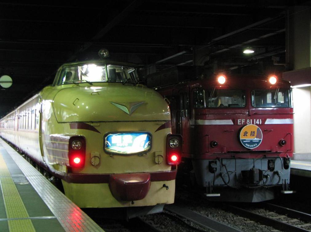 発車時間が迫ってくると、隣のホームに急行「能登」が入線してきます。