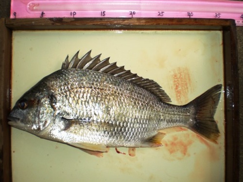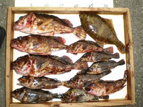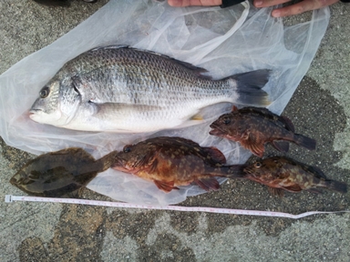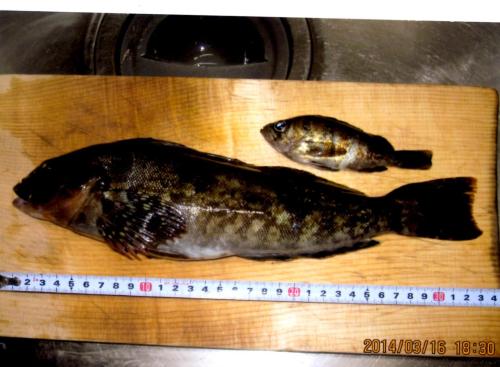 こんにちは。3月19日の日記です。18日は友人とワカメ採りの予定でしたが悪天候との予報で中止。ところが雨なんて一滴も降らかったし、風もさほどなかった。大潮の干潮を狙ってたんですが天気を恨んでもストレスが溜まるだけですので次の機会をうかがうとします。さて、今日の釣果です。まずは大阪市福島から来られた西山様親子。釣行時に魚が釣れたら写真を撮ろうネと見送った所、やってくれました。35センチのキビレ。めっちゃ喜んでました。ぴんぴんと跳ねてましたので店で血抜きして持ち帰り刺身で食べるそうです。又、感想を聞かせてくださいね。続いて神戸のながた様さすがベテランの味を今回も醸し出してくれました。カレイ28センチ。ガシラ、アイナメ、クジメは20センチ越え。まだ、クーラーの中にガシラは数匹、いたのですが写真を撮り忘れてました(ごめんなさい)昨日の釣行を今日に換えて正解でしたね。個人的には徐々に釣果は上向いている様に感じますが皆様はいかがですか?では、又。