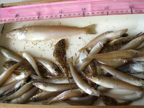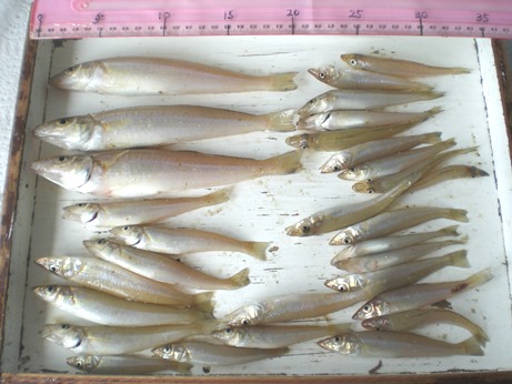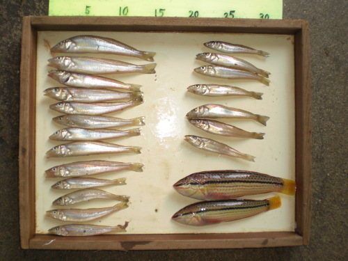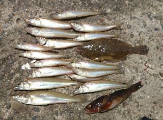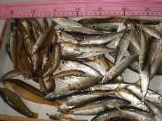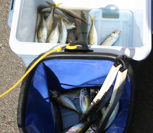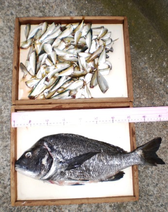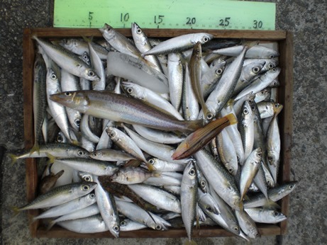 こんにちは7月23日の日記です今日は孫を連れて一年ぶりにサビキ釣りに出かけてました。千守防波堤の入口付近でサバ主体に底でアジを堪能してきました。大きなボラも寄ってきて苦労させられましたが2時間程、魚に遊んでもらい童心に戻ってました。当店のお客様も何人かおられましたが概ね30匹から50匹の釣果と思われます。東京から帰省されてた翔馬くんご家族も釣ってました。初めての釣りで想い出を胸に今晩、東京に帰るのですね。絵日記に書いてくださいね。そして来年もまた、須磨に遊びに来てくださいね。大阪の三好様はブログネタにとキスをお持込くださいました。17cmを頭に30匹ほど。岩場でしたのでガシラも食ってきてますね。同じくキスの釣果は尼崎のOさんメールで釣果報告を頂きました。小型はリリースして食べる分だけ持ち帰りだそうです。近場だったのでアタリも鮮明でキスのアタリを十分に満喫されたとの談でした。餌は青虫針は流線7号(ハリス1.5号)当店で6セット 220円で販売してますのでどうぞ。では、夏風邪が流行っている様ですのでどうぞご自愛くださいませ。