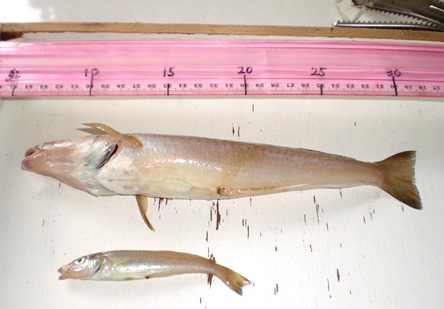 おはようございます。7月3日の日記です。久しぶりの雨です!野菜の水やりから解放されてます。商売も暇ですので溜まっている事務処理をかたずけようと思います。さて、昨日の釣果情報ですが神戸のMさんが釣果をお持込くださいました。何とキス26.5センチです。大きさを目視できる様にと平均サイズのキスも並べて写真を撮りましたので差がわかりやすいでしょう。長さだけでなく、太さも段違いです。これほどのサイズになれば単独行動してますので数を釣るのは至難の技でしょうが一匹釣れただけでもラッキー(実力)と胸を張っても良いかもしれません。しばらく梅雨空が続きそうですのでこんな時は次回の釣行のシュミレーションで爆釣をイメージするのもよさそうですね。<<釣りの格言>>「そうじゃ・・・一匹一匹を大切に丁寧に吟味して 釣るということじゃ・・・ 釣りの楽しみはその一語につきよう」「折れない竿と切れない糸で・・・なんでもかんでもゴリゴリと抜きあげるのは もはや釣りではなく 漁っちゅうことじゃ・・・」釣りキチ三平補)我家の愛犬ナナモモの掲載の依頼がありましたので釣りには関係ないですがアップさせて頂きます。
