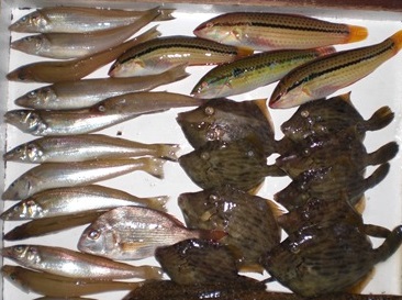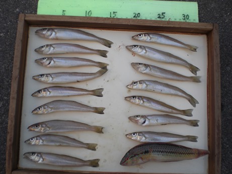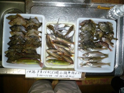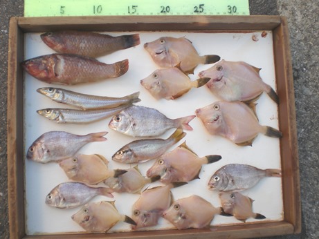 おはようございます。9月15日の日記です。全般的に目だった大釣りは少なく多種少量、中量の釣果だった一日です。色々な魚を釣ってファミリーの方には喜んで貰えたのではと思います。ただ、カワハギは明確なアタリがないので小さ目の仕掛けを使い、感で合わせなければ釣れない魚なのでちょっと難しいかもしれませんね。カワハギ釣り用の仕掛けも準備してますのでお気軽にお尋ねください。では、昨日の釣果をアップします。大阪の稲田様の釣果です。ハゲ11匹チャリコ5匹キス2匹磯ベラ2匹餌はシラサエビと虫類をお使いでした。カワハギが好調でしたね。続いて滋賀のTさんの釣果です。7時から16時まで苦心の末の釣果です。いつもは好漁を記録するのですが辛抱の釣りでしたね。 キス 20匹(+Sさんからの貰いもの9匹) テンコチ30匹(+Sさんからの貰いもの6匹) イワシ 1匹 ベラ 5匹(小さいです) ピンギス 6匹(リリース) タイの子 3匹(リリース) ワニエソ 2匹(リリース) カワハギ 1匹(Sさんからの貰いものです) ボラ 1匹(50cmクラス、玉入れしてくれる人がいたけれど、最終は針が折れて上がらず)明日は定休日(月曜の振り替え)で朝5時から11時までの営業ですので宜しくお願いいたします。