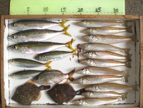 おはようございます。9月28日の日記です。ファミリーフィッシングの対象魚であるアジもここ数日、戻ってきた様で運動会で来れなかった人は残念でしたが須磨海岸は賑わいました。サビキと同様、際釣り、投げ釣りも五目釣りの様子でアジ、サバ、キス、ベラ、カワハギ、チャリコ、コチ、グレが釣れてます。サビキにエサを付ければ上記の魚もより釣れますのでご参考までに。色々な魚の引きをお楽しみください。他には夜の太刀魚、アナゴ、アオリイカが盛んですね。では、昨日の釣果写真です。寝屋川のHさんキス16匹、ベラ1匹餌は石ゴカイでした。そして神戸のAさんアジ、ハゲ、チャリコ、グレの多彩な釣果。サビキ釣りでした。サビキにエサ付けであれば色とりどりの魚が掛かりますよ。アジは神戸のFさん日中に餌が無くなった時に食ってきたと急いで店に来られました。全て当店の近隣での釣果です。尚、カワハギはエサ取りの名人ですので小さい針をお使いください。当店ではカワハギ釣り用の胴付仕掛けも販売しておりますので手に取ってご確認ください。明日は定休日ですが11時まで営業しております。