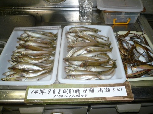 おはようございます。9月14日の日記です。いつもブログをご覧いただきましてありがとうございます。見てるよ!の声を嬉しく感じております。今日は理屈抜きに朝から快晴で気持ちが良い~というのが本音です。私も海岸で寝転がって瞑想に耽りたい気分ですが商いに頑張りますでは、昨日、今朝の釣果情報です。キスは寝屋川のHさん23センチを筆頭に20匹。いつものHさんらしくない釣果ですがこれも釣り、次回は3ケタ狙いをお願いします。続いては京都のオカダ様参考になるメッセージを頂いてますので原文そのままをご紹介します。***********************************本日は新鮮なエサをありがとうございました。キス狙いで出かけたものの、どんなに探ってもマイクロピンしか釣れず、地元の方も今日はダメだとのことでした。そこで、余った青イソでカワハギ狙いに切り替えました。結果、リリース含め30匹ほど釣れました!食い込みの良いメバリングロッドを、使ったのが良かったのかもしれません。その他、チャリコ、ベラが釣れました。また、行く時はよろしくお願いします。頑固な私としては機転をきかせた思考が羨ましいです。***********************************本日、早朝に釣果をお持込くださいました藤澤様です。夜釣りの成果です。チヌ:35cmアナゴ;いっぱいアジ、サバお土産をいっぱいのご帰還でした。アナゴが釣れるかどうか不安になっている方にも朗報ですネ。今回はチヌでしたが真鯛、良型のキス、ハネ等も掛かりますので心の準備をお忘れなく。では、今日も良い日でありますように。明日は月曜日ですが休日ですので営業しております。都合の良い方は爽やかな潮風に吹かれにお越しください。